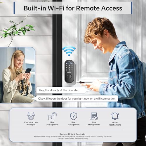 App Control with Built-in Wi-Fi: Effortlessly manage your smart locks for front door via the app, whether you’re at home or away. With built-in Wi-Fi, no additional gateway is needed, enabling smooth remote control without distance limitations. You can create one-time or scheduled access codes, grant or revoke access, and manage user permissions—all from your smartphone. The app also provides access logs for enhanced security. Notice: To extend the battery life in the door lock, the Wi-Fi function is activated only after the doorbell button is pressed, enabling effortless remote control.